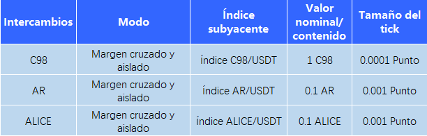 HTX Futuros lanzará los swaps C98/USDT, AR/USDT y ALICE/USDT a las 6:00 am del 7 de septembre de 2021 (UTC). Utilizando la stablecoin USDT como moneda de margen, estos swaps soportan las operaciones bidireccionalmente. Los elementos correspondientes de estos swaps con margen de USDT son los siguientes: