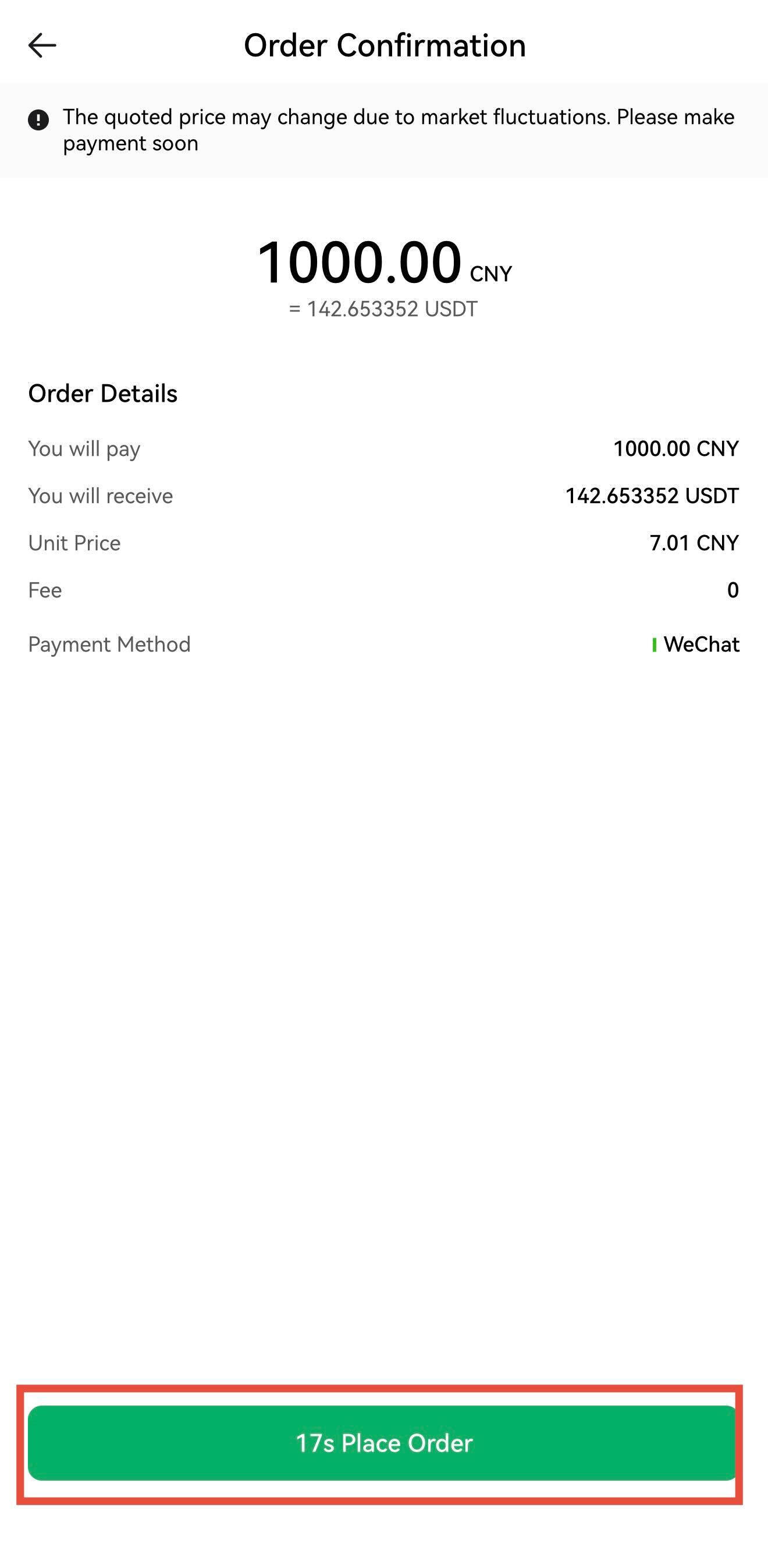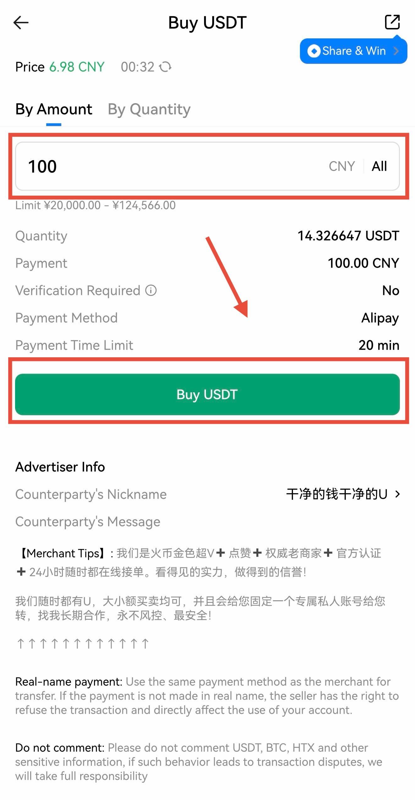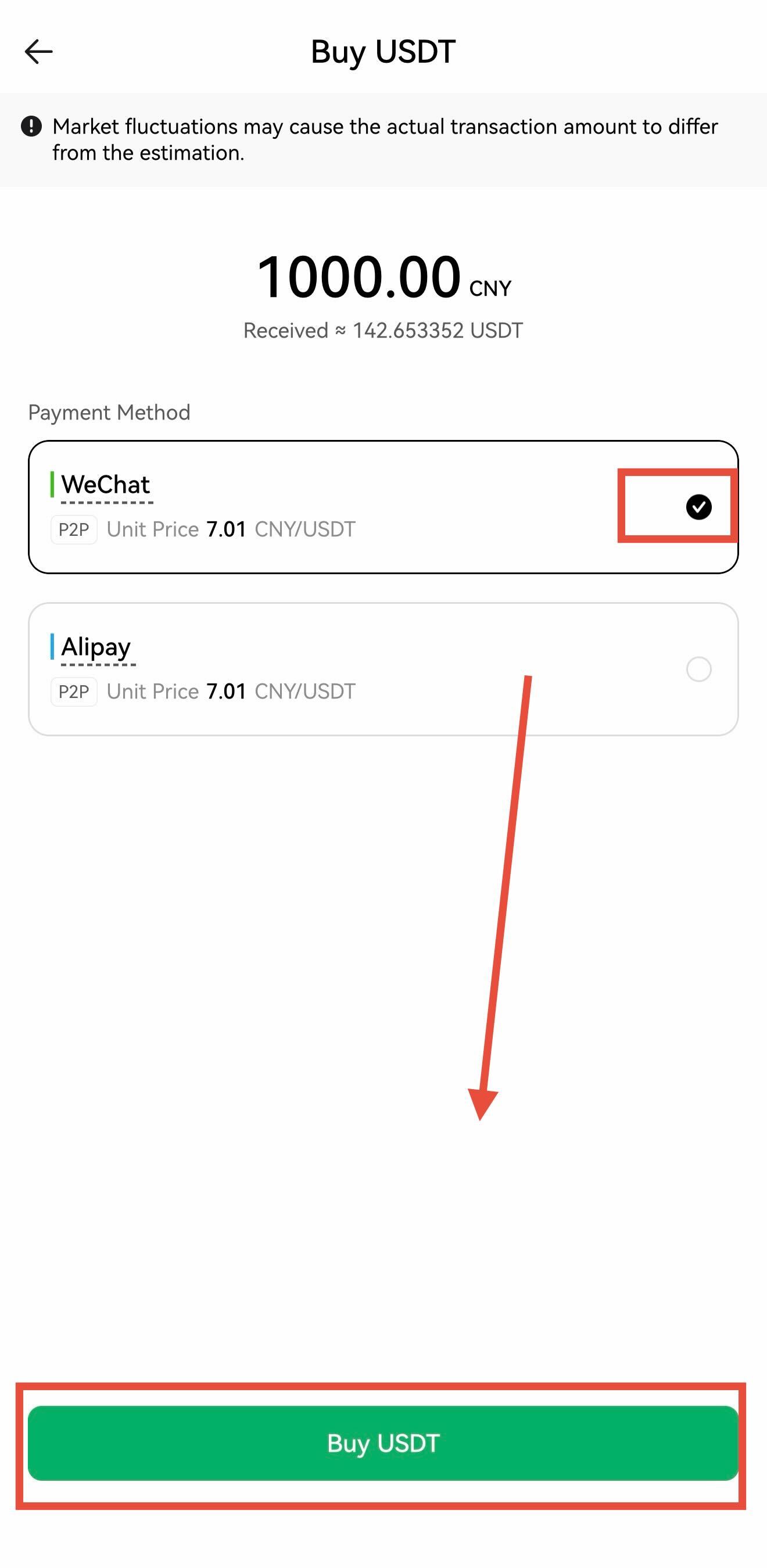 Step 2: Enter the amount or quantity you wish to buy > Tap Buy USDT.