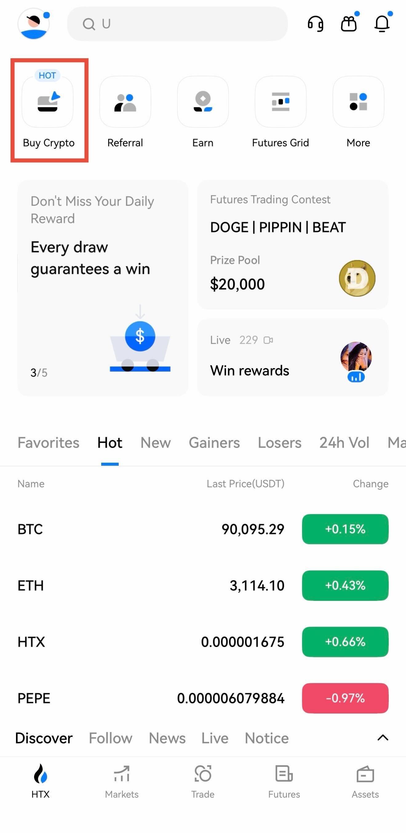 Access Buy Crypto on the HTX App. Next, tap the "..." icon in the top right corner and select Payment Methods to add your preferred payment method.