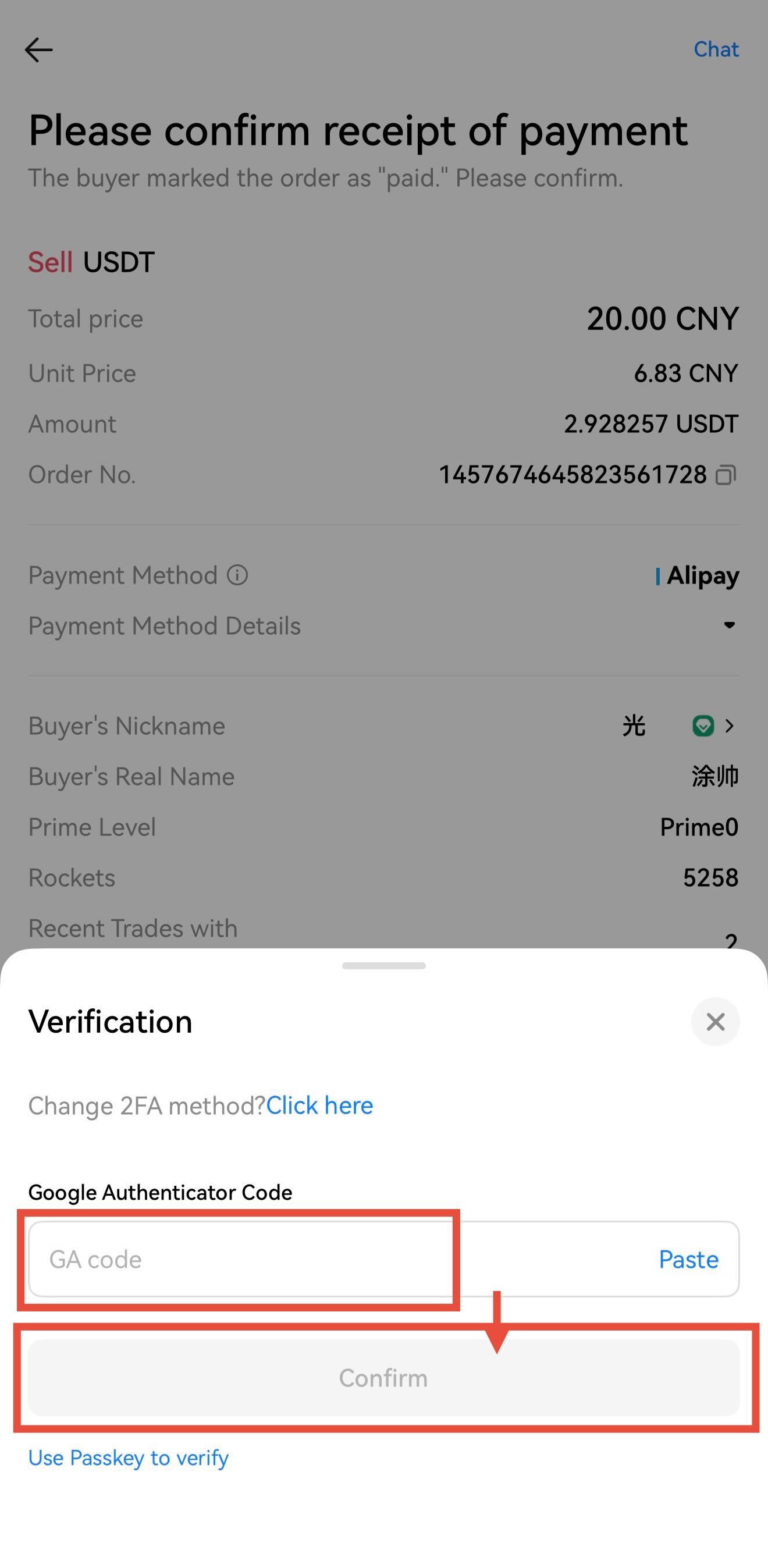 Step 3: Wait for the buyer to make the payment. You can tap the Chat button to communicate regarding the payment status > Once the buyer marks the order as paid, you must log in to your receiving account to verify that the funds have arrived and check that the sender's name matches their verified platform identity, reviewing any provided payment screenshots or recent transaction records > After confirming everything is correct, tap Confirm Release and enter your GA code > The USDT will then be sent to the buyer, completing the transaction.