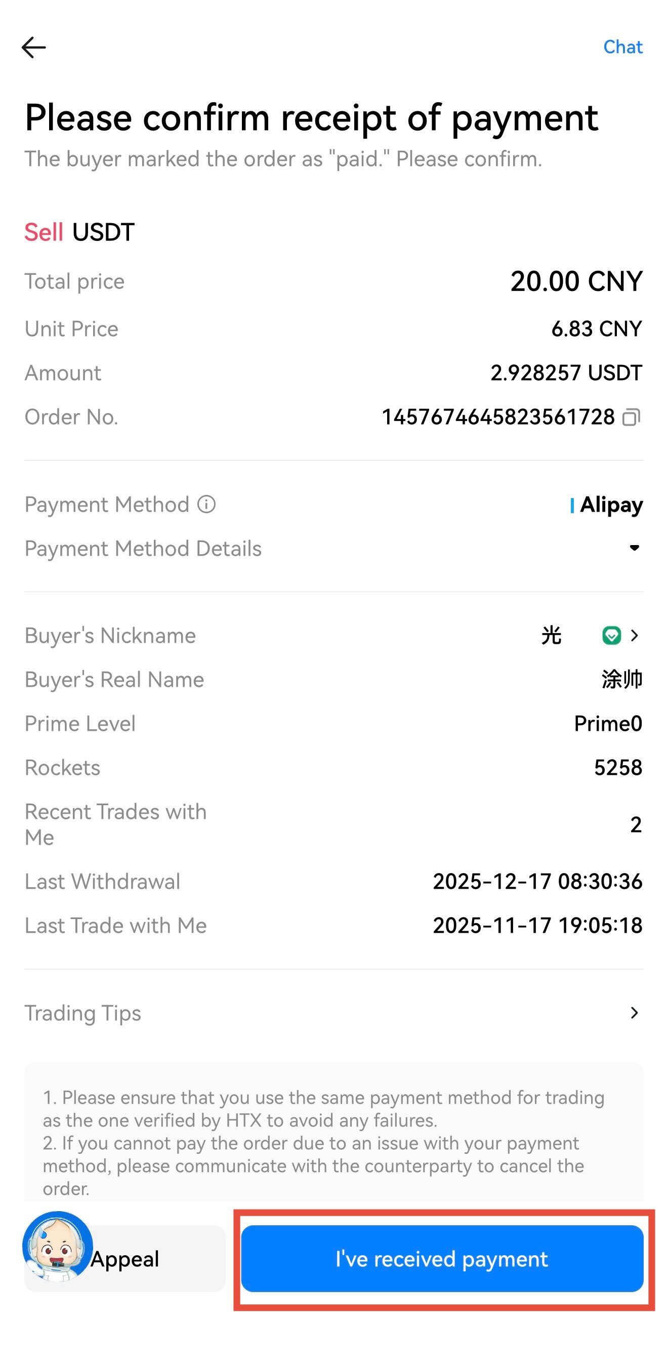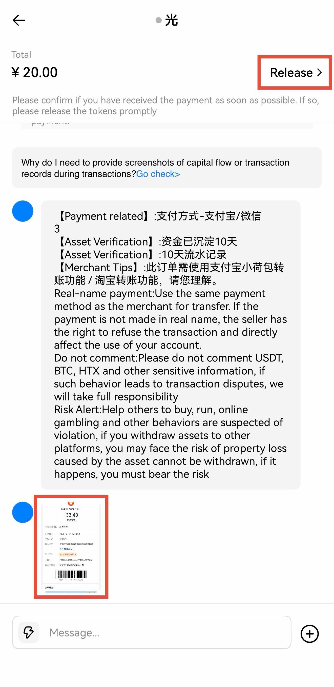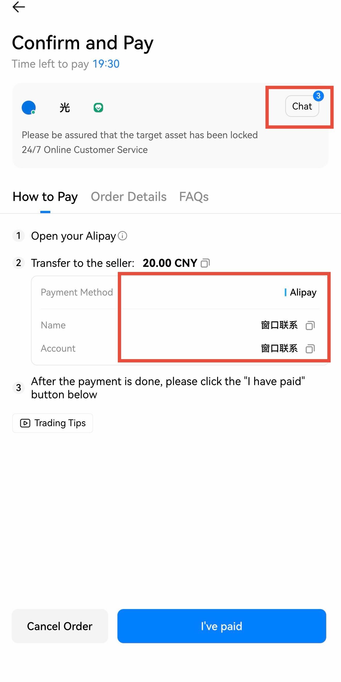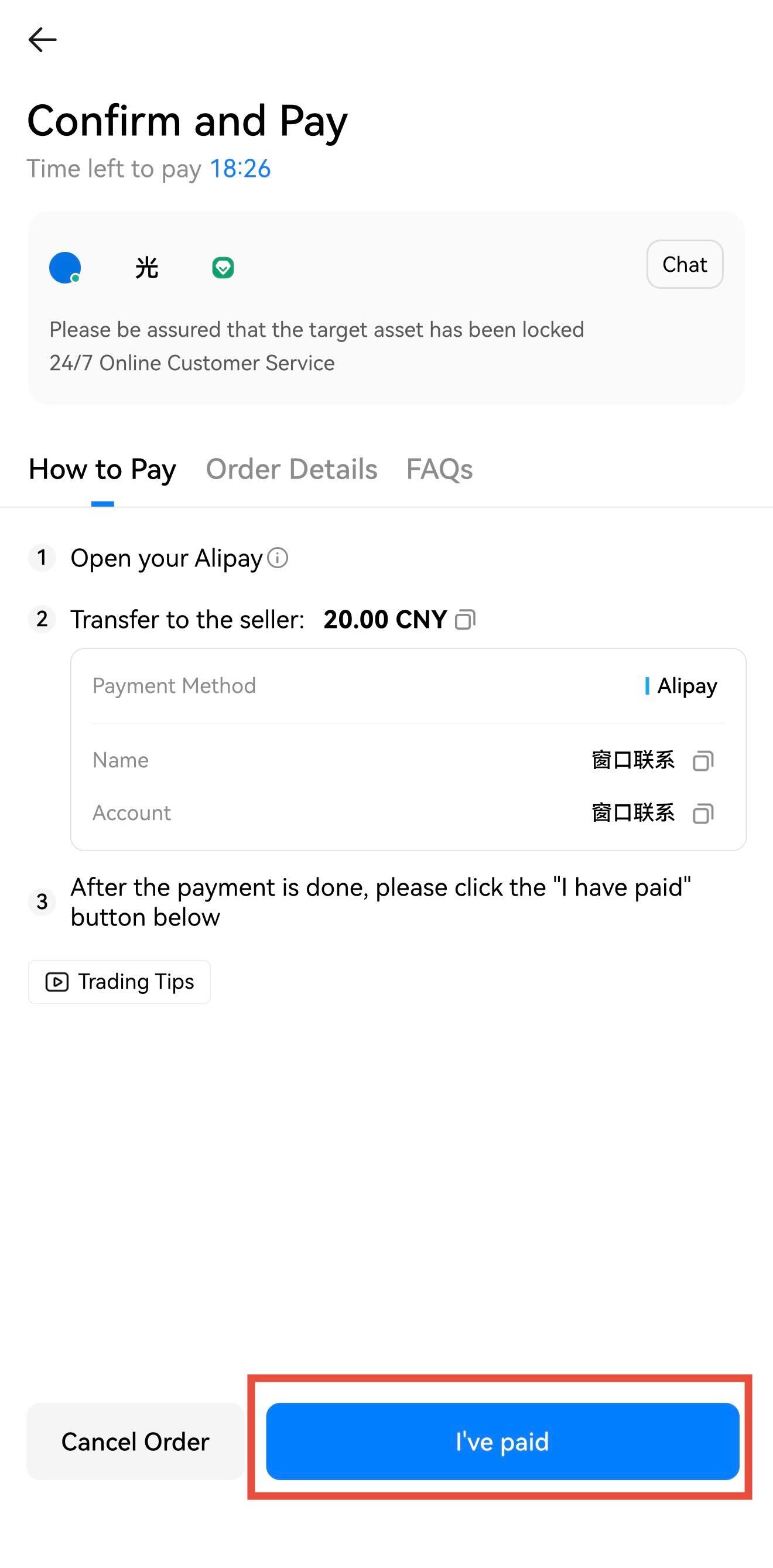 Step 3: Tap the Chat button to review the seller's specific requirements > Confirm the details with the seller, making sure the recipient's name matches their verified real name > Once confirmed, proceed with the payment using the displayed information > After the transfer is finished, tap "I have paid, notify seller." > The seller will then release the assets to complete the trade. Note: For delayed responses, use Voice Call (available in App version 10.9.0 and above).