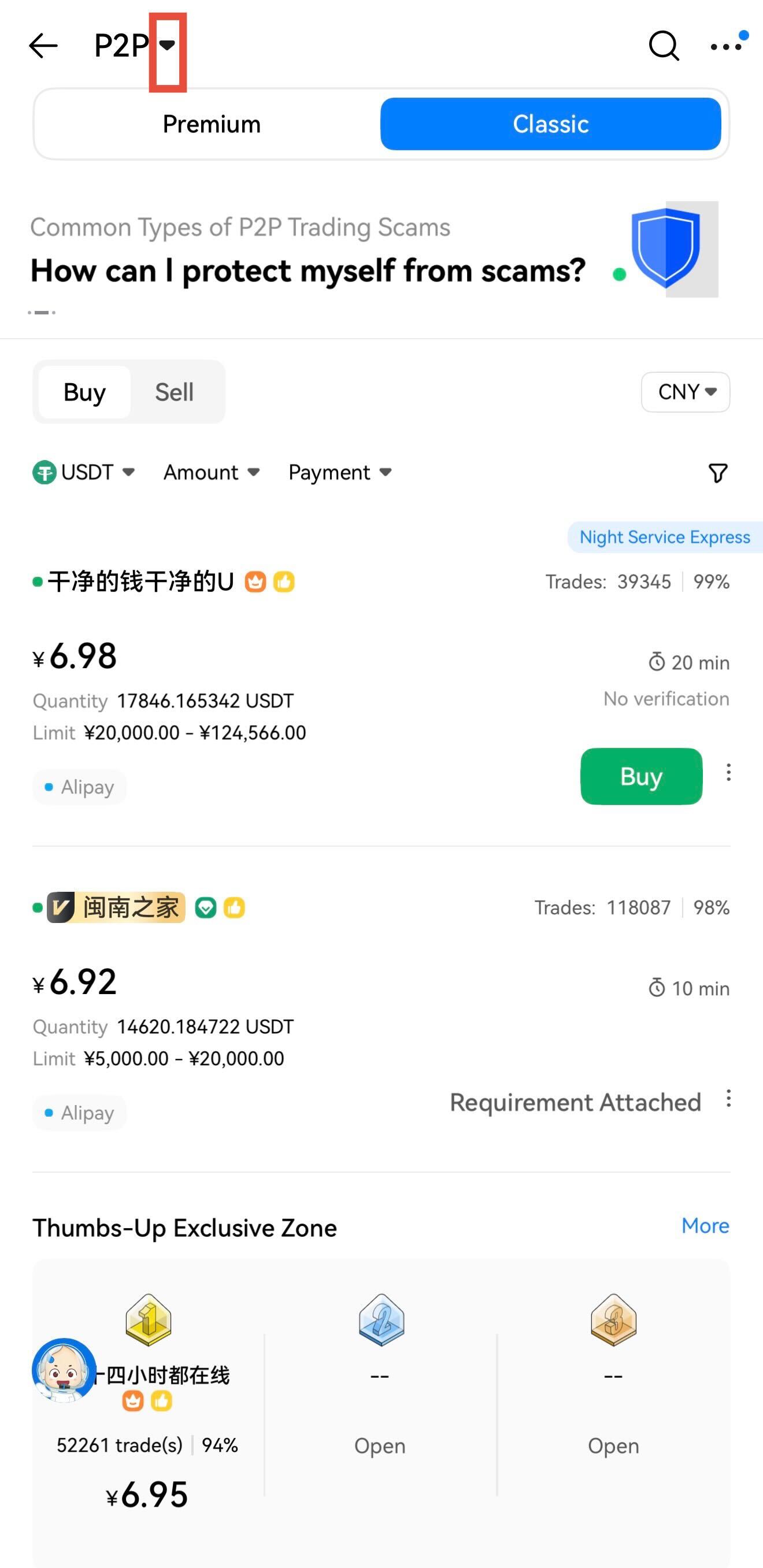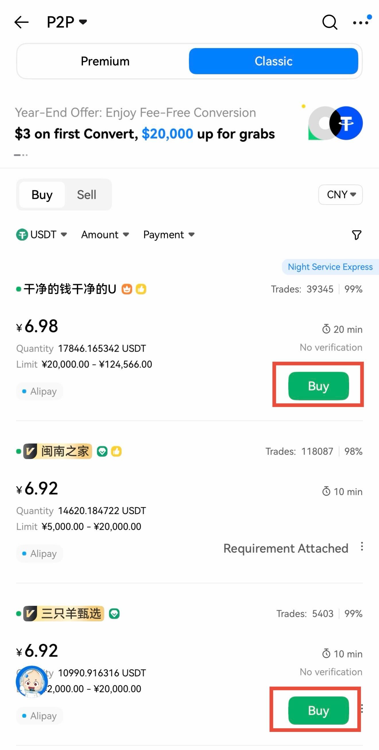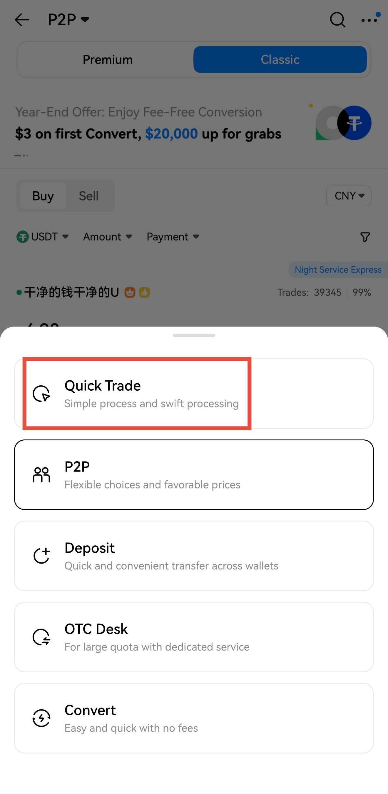 Method 2: Quick Buy Mode. Enter Quick Buy mode by tapping the Quick Trade button. Simply enter the purchase amount, choose a payment method, and the system will automatically match you with a verified seller.