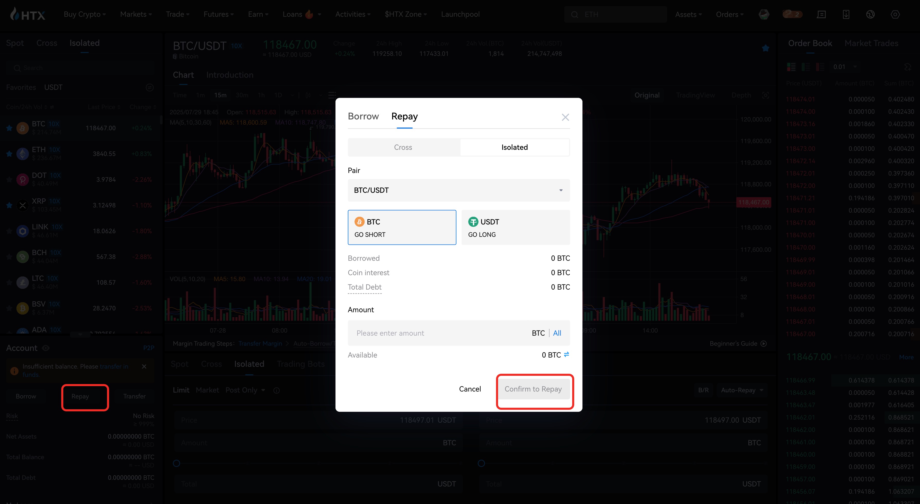 Step 1: On the margin trading page, click "Repay" under the candlestick chart. Select the asset you want to repay and enter the amount in the pop-out window. You can see the outstanding amount of the asset, the interest, and the total amount to repay.