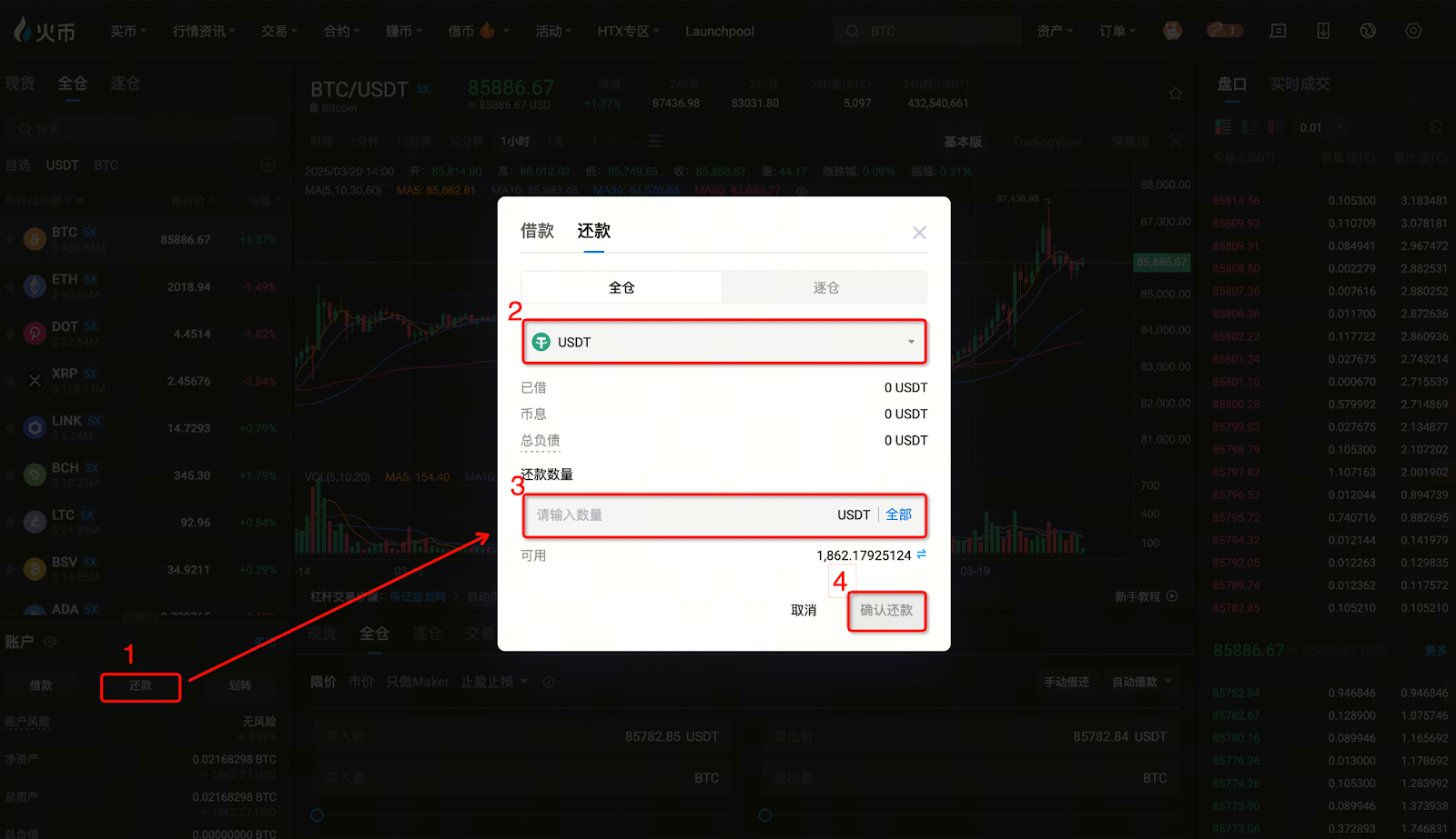 除了使用手动还币方式归还欠款外,用户还可以选择通过交易完成欠款的归还。以 USDT 为例,当您持有 BTC 并存在 USDT 借款时,通过以下操作可以完成 USDT 欠款的归还。