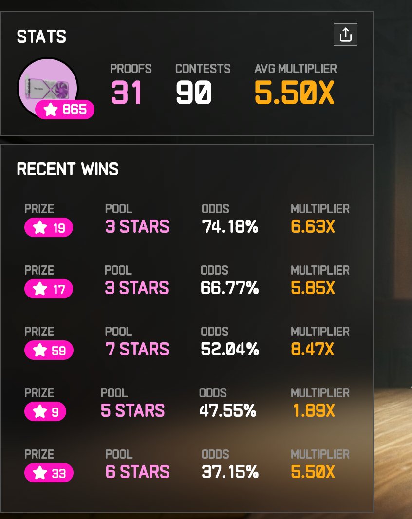 succinct @SuccinctLabs 第一阶段游戏结束了。第二阶段也不能bid了。我第二阶段一共干了865个星星,31次中奖。目前2.5阶段还在进行,这可能是最后的机会。对于普通用户的参与方式就是弄到prove去质押。可以去舔 @0xCRASHOUT ,让他发prove。目前有4000多个prove质押到我这里。我验证了3738个proofs。想要嘴撸的,还可以参与。这个项目我看是大毛,继续build。