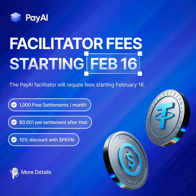 ⏰ 提醒PayAI 将于 2 月 16 日开始对其促进者收取费用。📌 关键点 - 免费层保持免费(每月最多 1000 笔交易) - 超过此限额:每笔交易 $0.001 - 使用 $PAYAI 支付可享受 10% 折扣 - 用于信用的 $PAYAI 将被销毁 🔥