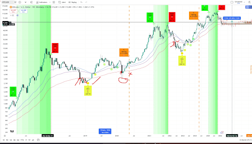 The weekly chart shared in the analysis shows previous halving dates, including May 11, 2020, and April 19, 2024, and overlays green accumulation zones around profitable long-term entry points. Price compression into those zones in previous cycles came before explosive upside moves that eventually led to new all-time highs.
