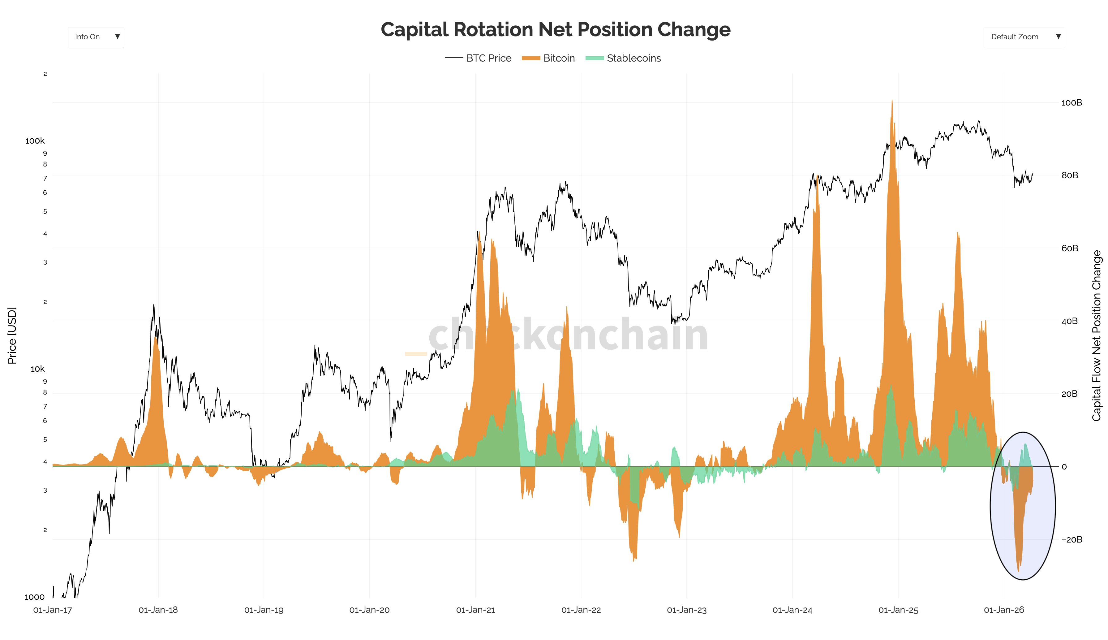 Highlighting data from Checkonchain, Darkfost based their analysis on the Capital Rotation Net Position Change, which measures the flow of funds between major cryptocurrencies (Bitcoin, in this case), stablecoins, and fiat currencies. This metric tracks whether investors are moving their capital into riskier assets (risk-on sentiment) or to risk-free assets (flight-to-safety sentiment).