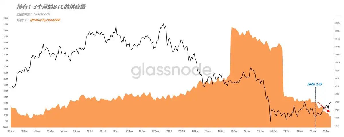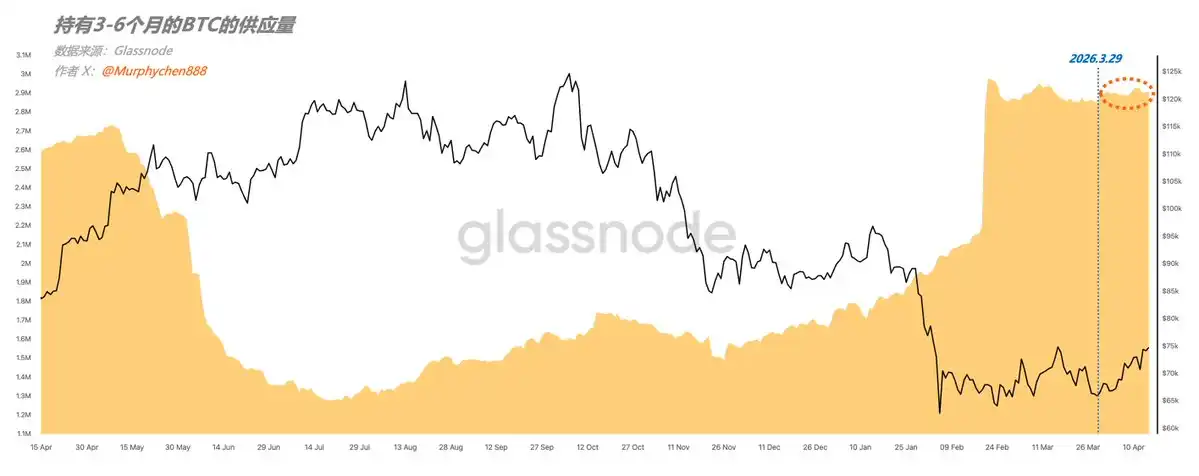AAfter March 29th, the supply of BTC held for 1-3 months showed a clear declining trend. Since the supply of coins held for 3-6 months did not increase significantly, this indicates that the 1-3 month supply was sold during the price rebound rather than being held longer.