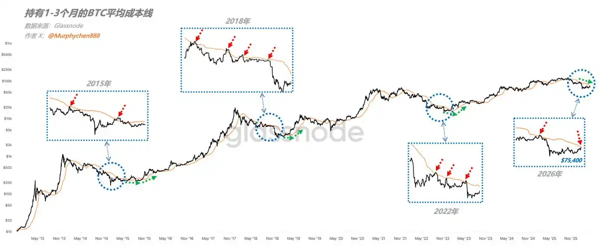 From the chart, it can be seen that in all past bear market cycles, the 1-3m_RP has been a key resistance level for rebounds during downtrends. This is because holders of 1-3 month筹码 (chips, a term for crypto holdings) are not very firm. A large portion of them did not intend to hold long when they entered the market.