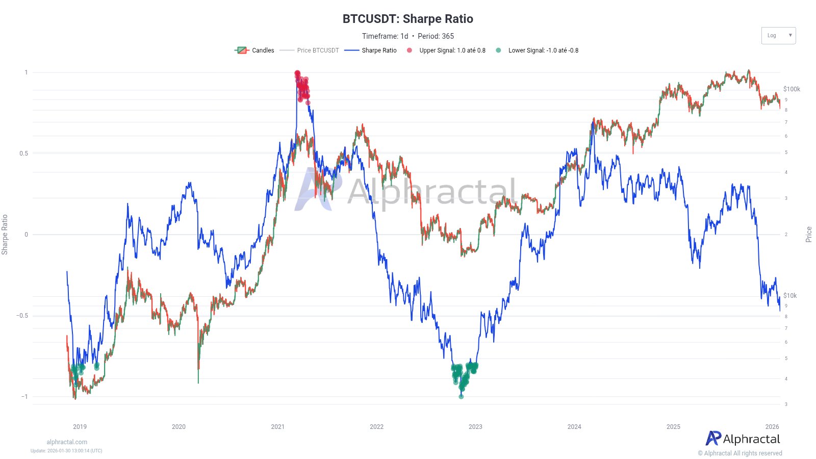 Bitcoin's price has dropped to around $81,000, reinforcing bearish sentiment amid factors like geopolitical tensions and liquidation cascades. According to Joao Wedson, founder of Alphractal, the Bitcoin Sharpe Ratio—a measure of risk-adjusted returns—is declining faster than the price itself, indicating the market is taking on more risk for diminishing returns. This ratio turned negative earlier in the year, yet BTC's price continued to rally briefly before the current downturn. Historically, such a rapid decline in the Sharpe Ratio often leads to extended periods of sideways or negative momentum. Wedson warns that if Bitcoin loses the $81,000 support, a deeper capitulation similar to 2022 could occur, potentially driving the price down to $65,500. As of now, BTC has slightly recovered to above $83,000 but remains down nearly 8% over the past week.