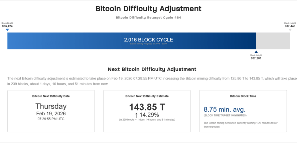 Changes in the Difficulty occur about every two weeks in events known as adjustments. The upcoming such event happens to be tomorrow, February 19th. Below are the details related to this adjustment from CoinWarz.