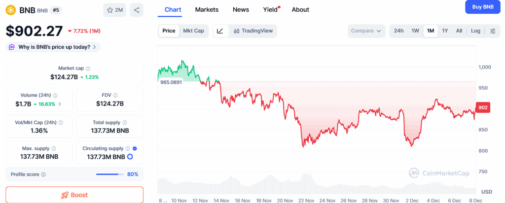 Analysts expect BNB to accelerate once it challenges resistance at $905, which historically triggers stronger follow-through patterns. Higher breakout zones around $932 and $958 could act as stepping stones toward triple-digit growth as cycle liquidity deepens. These strong structural signals support forecasts that place BNB’s next peak near—or even above—the $1,600 region.