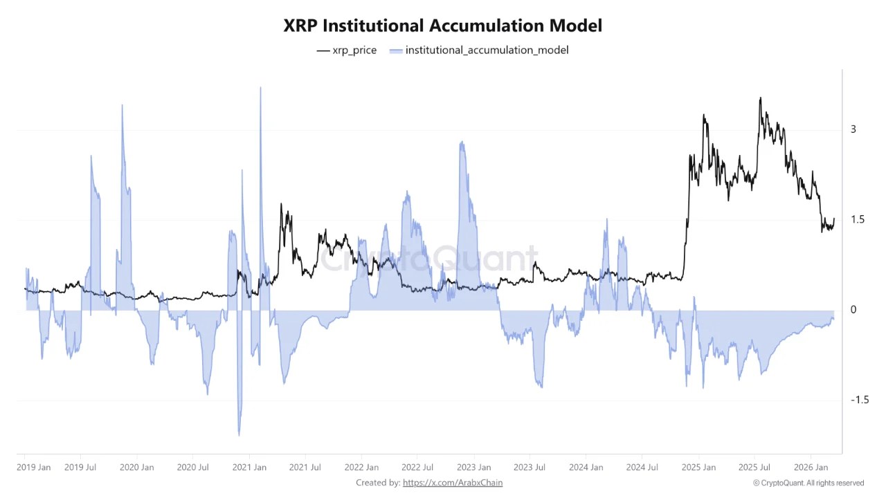 Beyond price action, on-chain and derivatives data are signaling a more subtle but important shift in market dynamics. According to a recent report by CryptoQuant analyst Arab Chain, data from Binance’s XRP Institutional Accumulation Model reveals a notable divergence between price behavior and underlying investor activity.