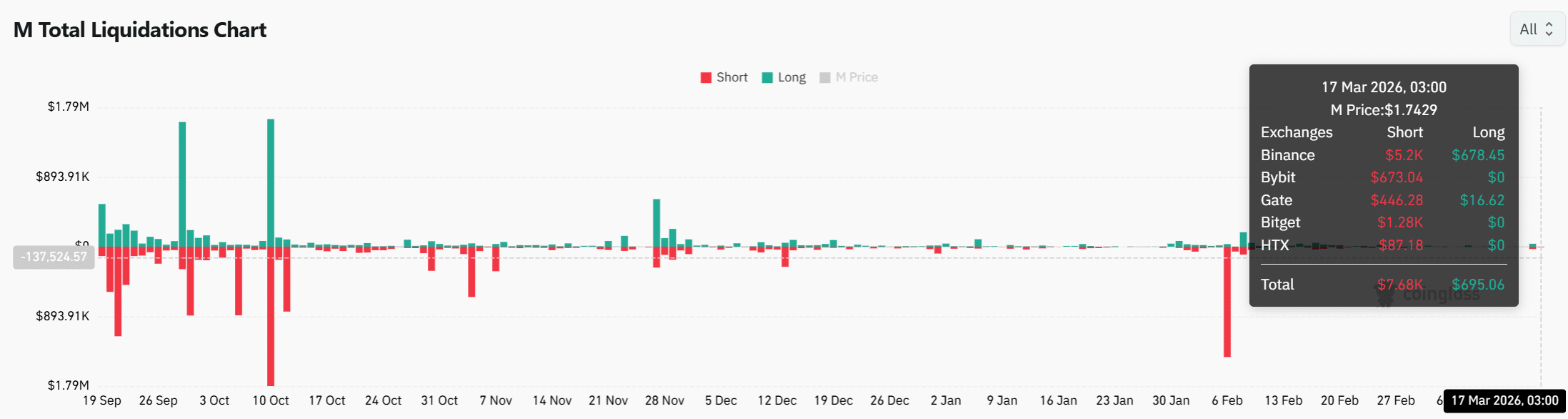 At the latest reading, short liquidations totaled around $7.68K, while long liquidations remained significantly lower, near $695, showing a clear imbalance.