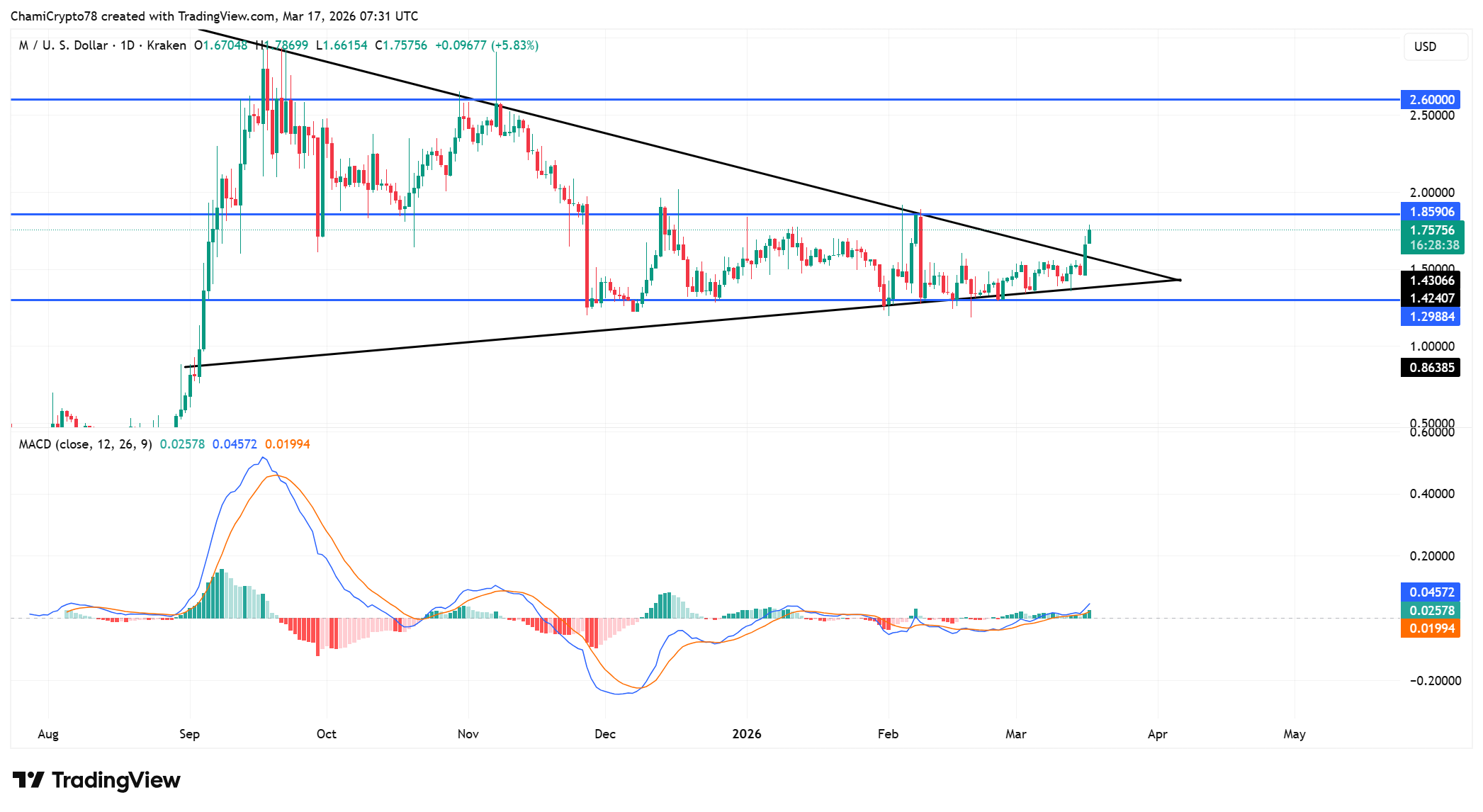 At the time of writing, M traded near $1.74, holding above the upper boundary of the triangle, which signaled that buyers have taken control of the short-term structure.