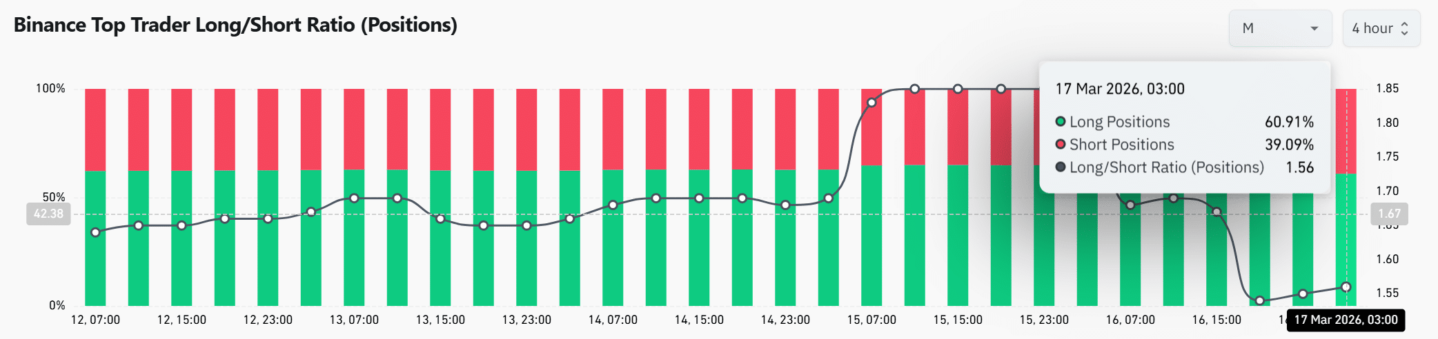 Binance top trader positioning showed a clear bias toward long exposure at press time, with 60.91% of positions favoring longs compared to 39.09% shorts.