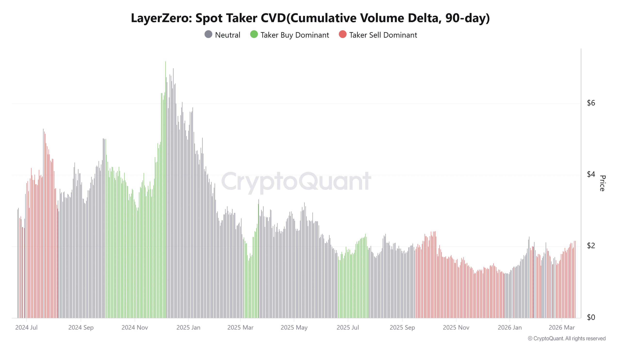 However, the 90-day Spot Taker CVD continues reflecting taker sell dominance, indicating that market sell orders still outweigh aggressive buying.