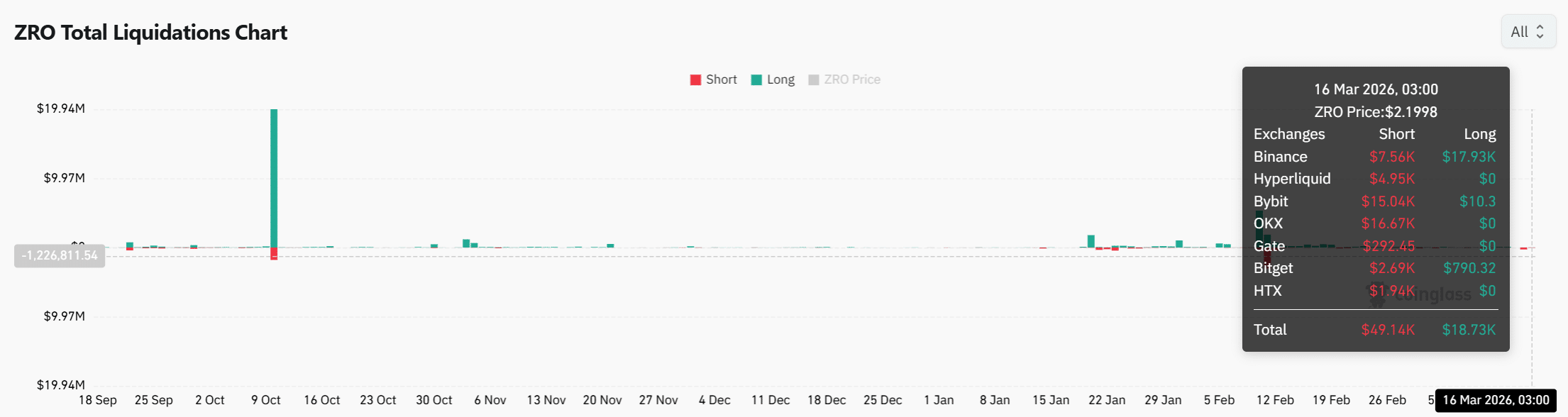 Derivatives data has also started reflecting the renewed price expansion across LayerZero markets. The total liquidation chart shows short positions absorbing slightly higher pressure during the latest move.
