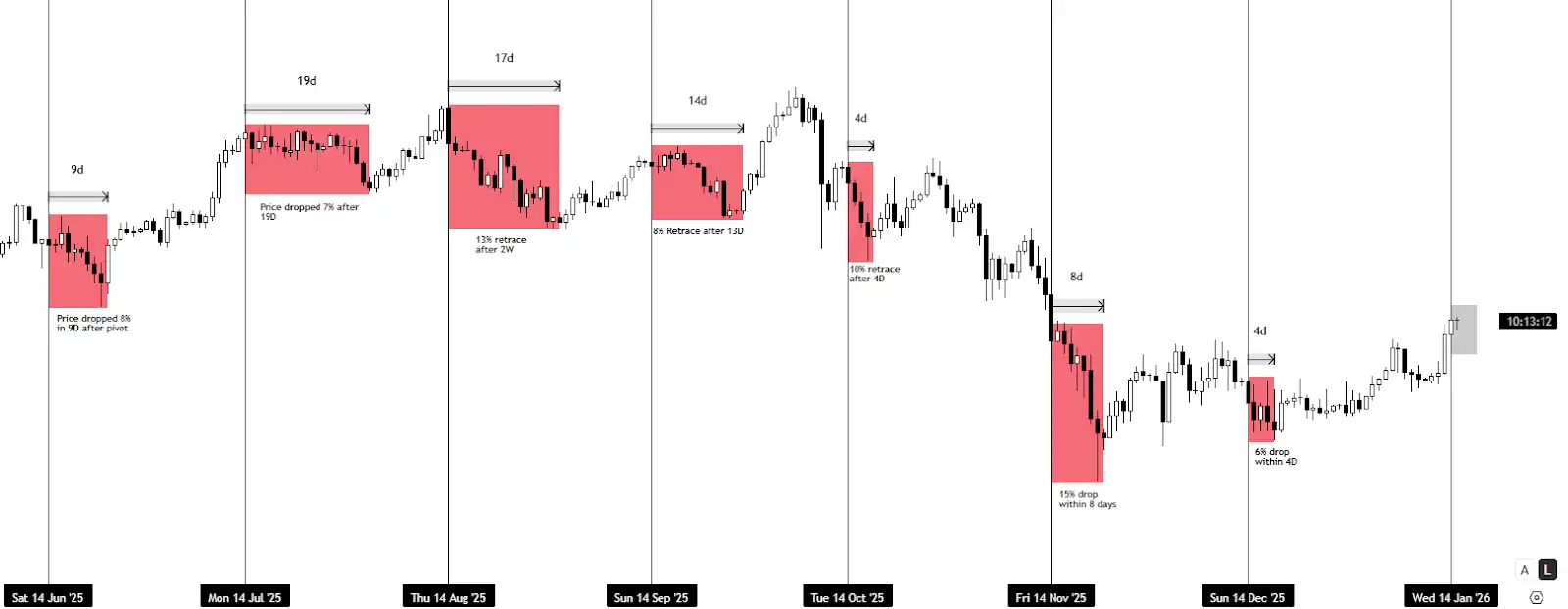 In January 2026, KillaXBT stated based on another prediction method that, according to the statistical pattern of the past 7 months, the market fell by an average of 8% within two weeks after the 14th of each month. Therefore, he predicted that after January 14, the market might enter a downward channel again, falling by at least 8%.