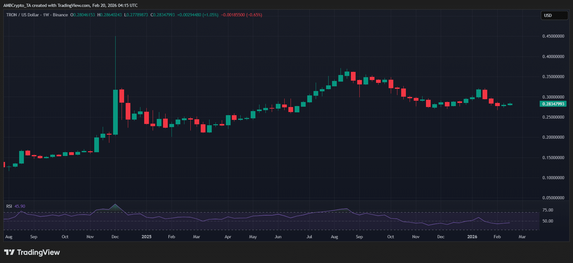 This strategy is especially notable as TRX trades near a critical support that, back in mid-December 2025, sparked a nearly 15% rally over the month to $0.30, before the market crash wiped out 100% of those gains.