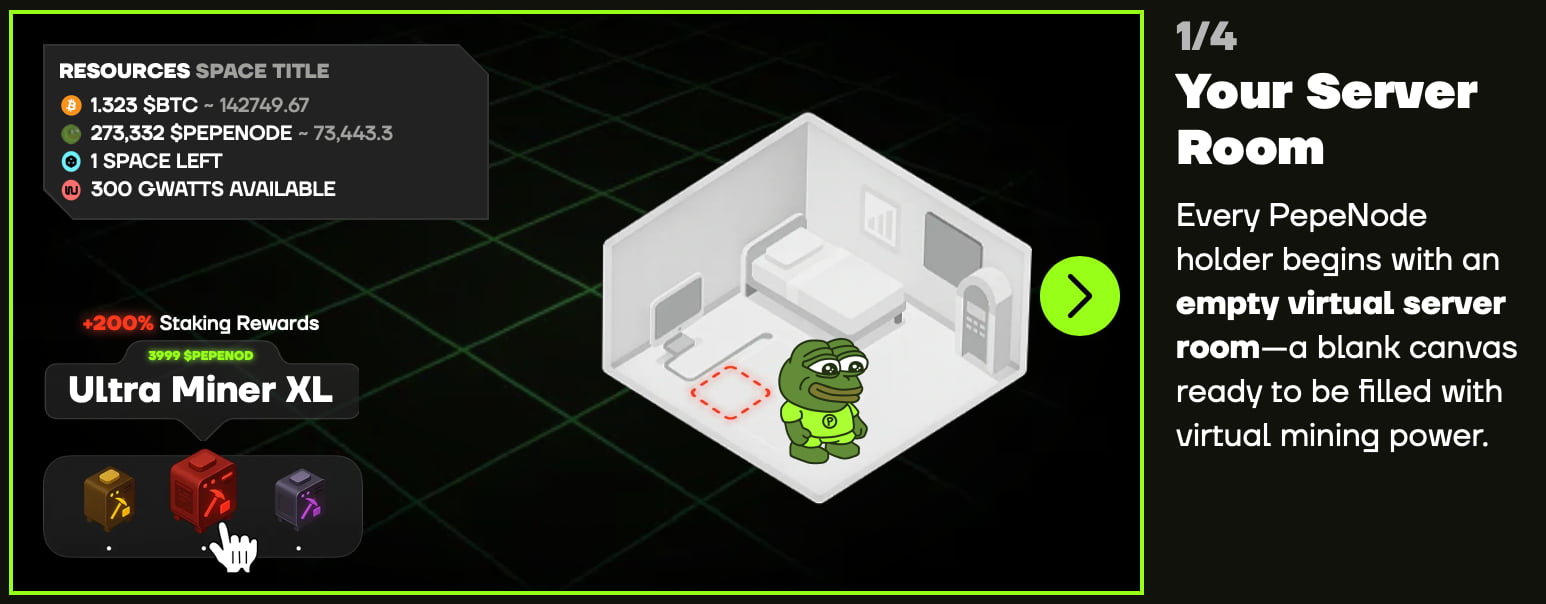 At launch, each player begins with an empty server room, providing a blank slate to build a mining operation from the ground up. Presale participants gain an early advantage by being able to immediately use their discounted PEPENODE tokens to buy nodes, expand infrastructure, and unlock essential upgrades. The gameplay closely reflects real-world mining operations, requiring players to balance energy usage, optimize cooling solutions, and allocate capital wisely to keep their rigs operating at maximum efficiency.