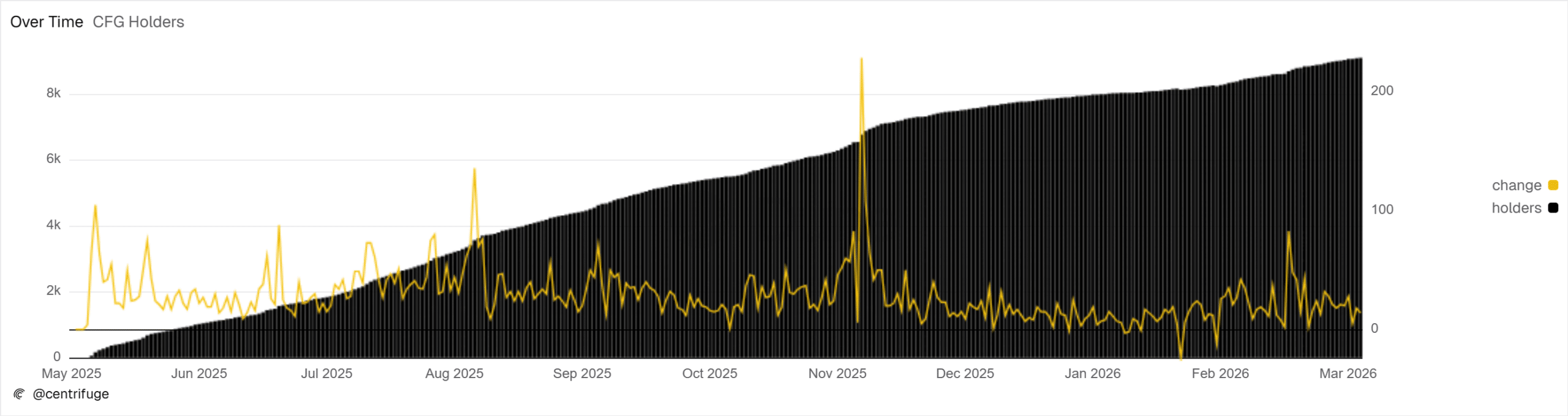 Dune Analytics recorded a total of 19,699 unique addresses interacting with CFG. Moreover, holders were growing steadily day by day since May 2025.