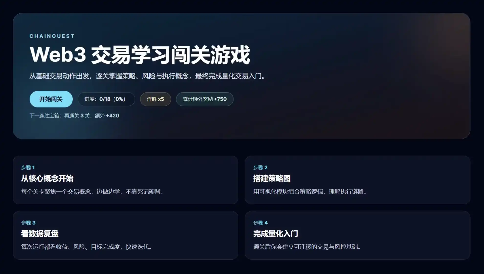 The Web3 Quantitative Trading Adventure Game is a product for learning Web3 quantitative trading through a level-based mechanism. Users can drag and combine strategy modules to run strategies directly, understanding quantitative logic while "learning by playing." Each level comes with diagnostic feedback, helping users know where the problem lies and how to adjust.
