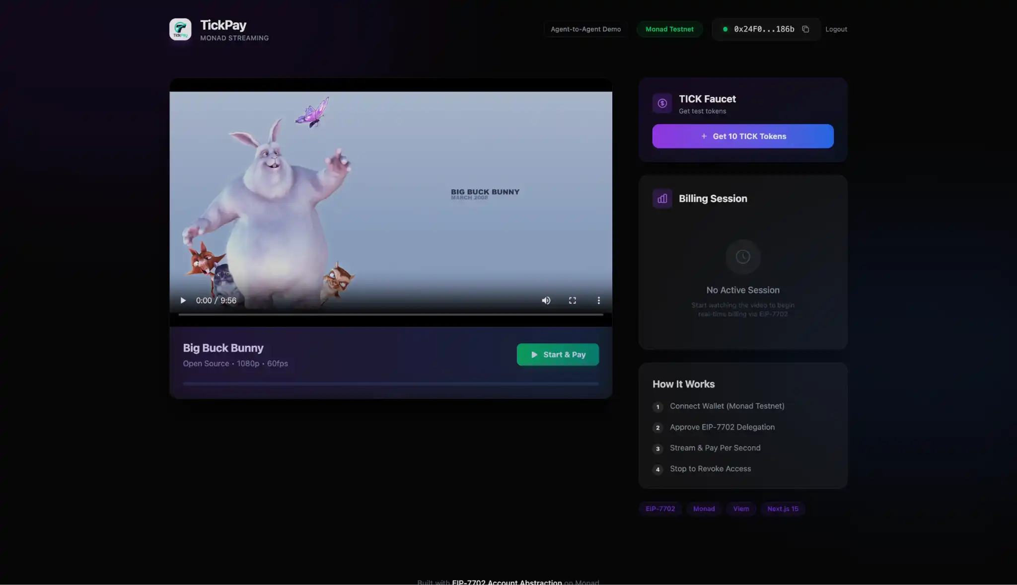 TickPay focuses on high-frequency, small-amount streaming payments, suitable for scenarios like video services billed by the second or AI APIs charged per call. Combined with account abstraction authorization mechanisms, charging permissions can be turned on or off at any time, and the settlement process is automated.