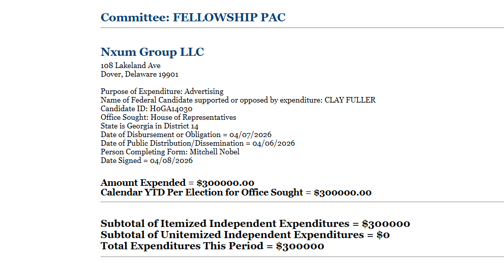 The group’s opening move was a $300,000 ad buy backing Clay Fuller, a Republican who won a special election to fill the Georgia 14th Congressional District seat left open after Marjorie Taylor Greene stepped down. That spending was formally reported to the Federal Election Commission and disbursed this week, roughly a month before Georgia’s Republican primary on May 19.