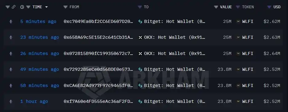 On-chain analysis showed that starting March 4, WLFI transferred a large number of WLFI tokens to centralized exchanges over two consecutive days: On the first day, approximately 146.4 million WLFI tokens were transferred to OKX and Bitget, worth about $15.4 million at the time; on the second day, about 16.71 million more were transferred to OKX, worth about $1.74 million. The two transfers totaled approximately 163.1 million tokens, with a total value exceeding $17 million.