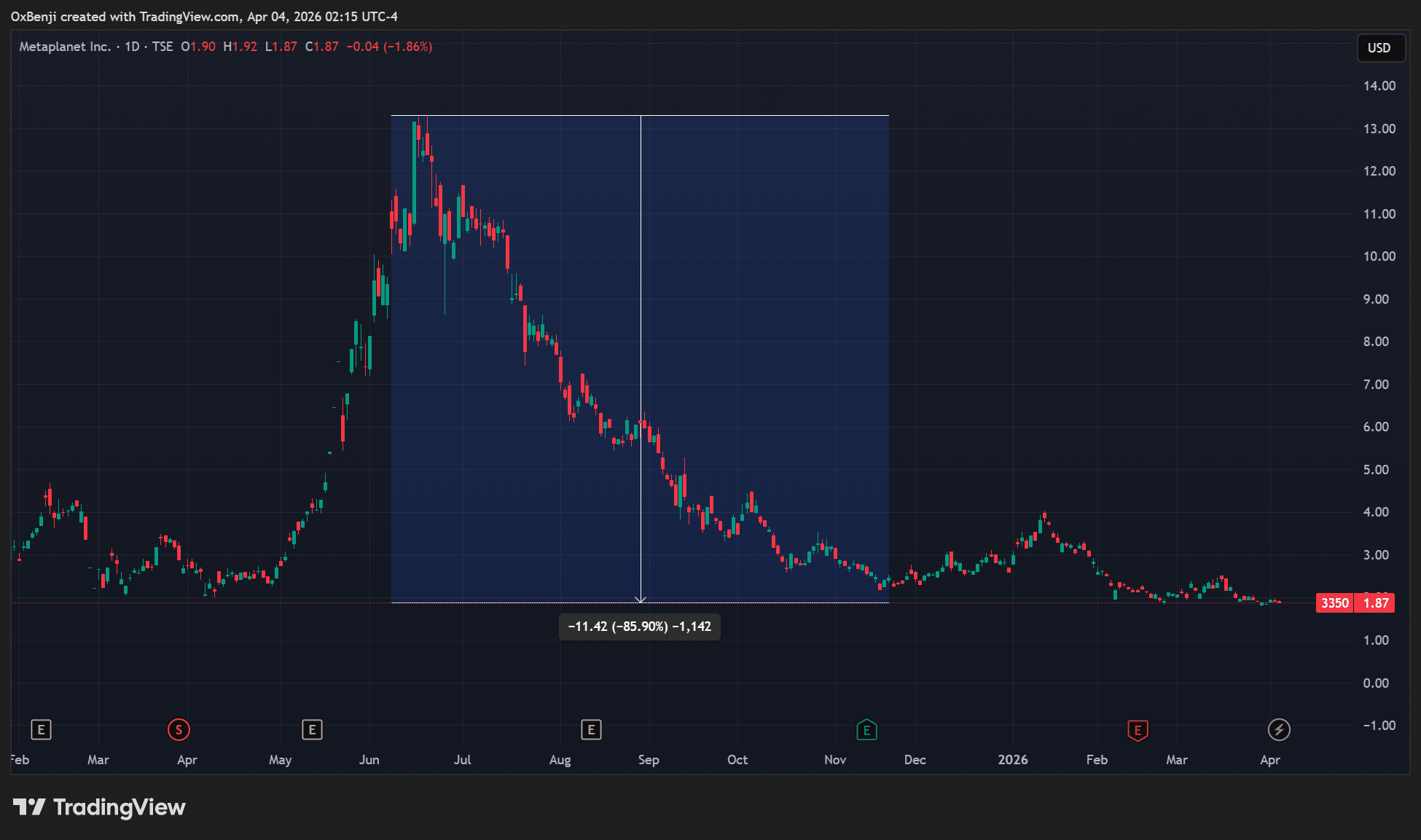 AAs of April 3rd, Metaplanet stock (3350) closed at $1.87, which is down 86% from its 2025 highs of $13.3.