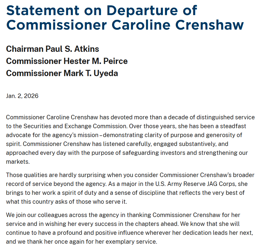 Caroline Crenshaw, who served as a Commissioner in the U.S. Securities and Exchange Commission (SEC), officially left the Agency on January 2, 2026. Her absence changes how the Crypto regulation decision would take place by the other three Commissioners, as Caroline was the one who was the strongest opposition to Crypto inside the SEC.