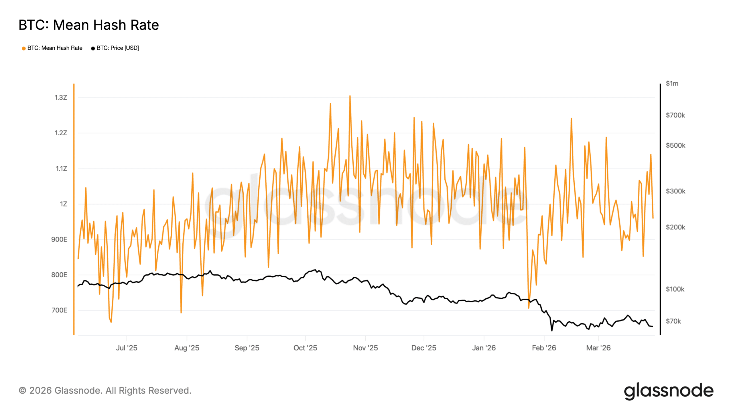 Recent data from Glassnode shows Bitcoin’s hash rate holding near elevated levels, fluctuating between 0.9T and 1.2T, even as prices have declined from late-2025 highs.