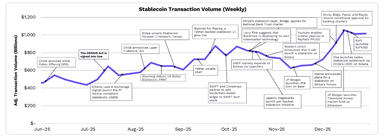 In December 2025, the 30-day moving average of adjusted stablecoin transaction volume was $3.5 trillion, 2.3 times the combined total of Visa, PayPal, and remittances.