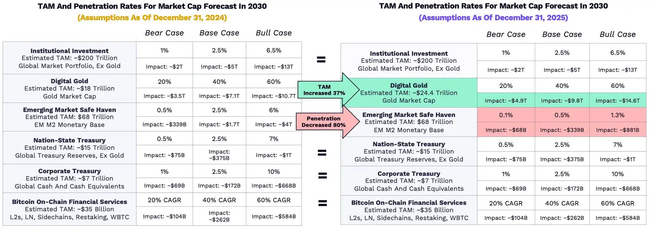As gold prices grew steadily and stablecoin adoption accelerated, two data points changed in ARK's Bitcoin valuation model for 2030: the total addressable market (TAM) for digital gold grew by 37% after gold's market cap rose 64.5% in 2025; and due to the rapid adoption of stablecoins in developing countries, the penetration rate for Bitcoin's characteristic as an emerging market safe haven decreased by 80%.