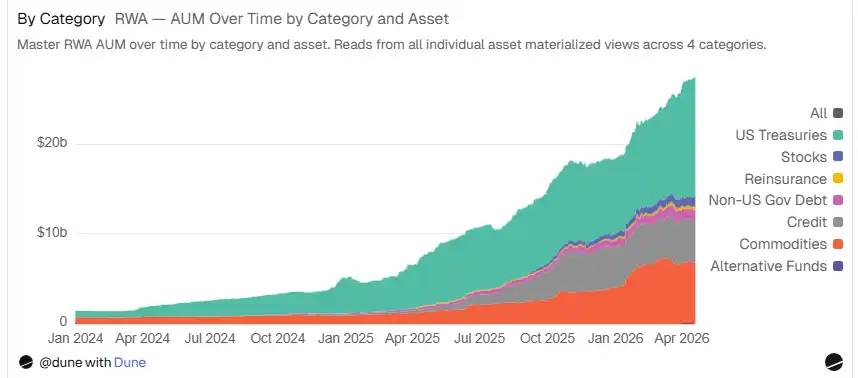These milestones further propelled the tokenization process. The total supply of stablecoins, serving as the settlement layer for tokenized assets, surpassed $330 billion, growing 12-fold since 2020. During the same period, the number of active stablecoins increased from 31 to 215. Tokenized RWAs showed a similar trajectory, with their Assets Under Management (AUM) growing 27-fold in two years to approximately $27 billion, expanding from a few initial categories to the seven categories tracked in the dashboard (including reinsurance and stocks).