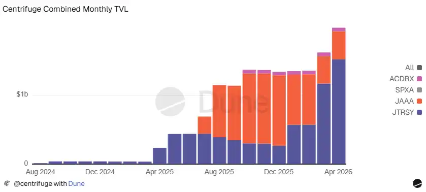 Centrifuge's report highlights both the opportunity and the gap for RWAs. It is one of the largest tokenization platforms, with institutional product AUM exceeding $1.85 billion: JTRSY (US Treasury tokenized fund) at $1.52 billion, JAAA (AAA-rated CLO tokenized fund) at $403 million, ACRDX (Apollo Diversified Credit Fund) at $52 million, and the recently launched SPXA (first S&P 500 index tokenized fund) at $3.7 million. However, only about $13 million of this is composable in DeFi: primarily through deRWA wrapper tokens and JAAA on Horizon.