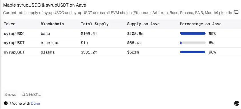 The result: 98% of syrupUSDT on Plasma and 99% of syrupUSDC on Base are actively deployed on Aave. Curators like Gauntlet on Morpho independently built leveraged vaults around Syrup without coordinating with Maple. syrupUSDC also reached $161 million on Kamino (Solana).