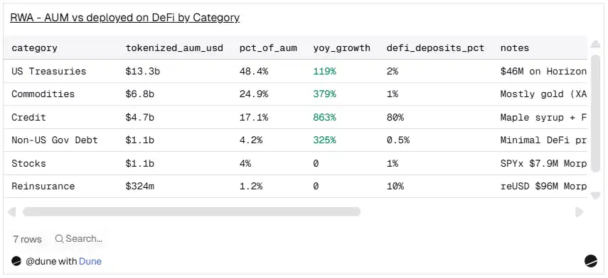 U.S. Treasuries account for 48.5% of tokenized AUM ($13.2 billion) but only 2% of DeFi deposits. Credit assets account for 17% of AUM but dominate deposits at around 80%. Commodities account for 25.2% of AUM but constitute almost less than 1% of DeFi deposits.