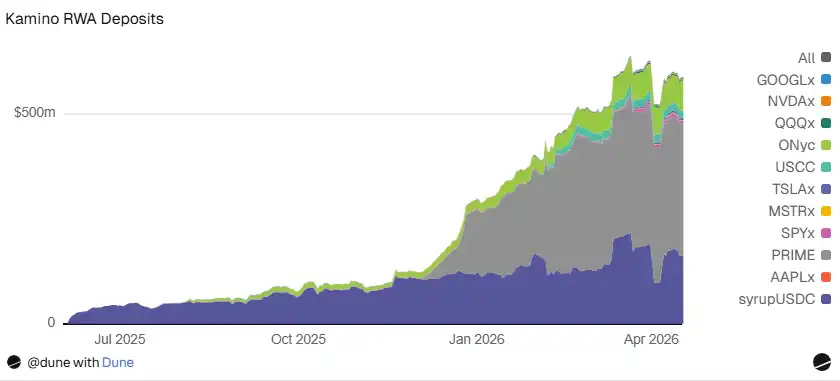 • Kamino ($587 million): The largest lending protocol and RWA platform on Solana. This includes $315 million for PRIME (HELOC lending yield), $161 million for syrupUSDC, $71 million for ONyc (reinsurance), $18 million for USCC, plus xStocks markets (covering seven tokenized stocks totaling $21 million).