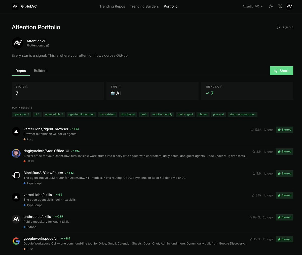 Stop wondering why your killer product remains unseen. Come build your portfolio. Place your attention bets on the next 200k-star repo. Leave a trust trail that compounds forever.