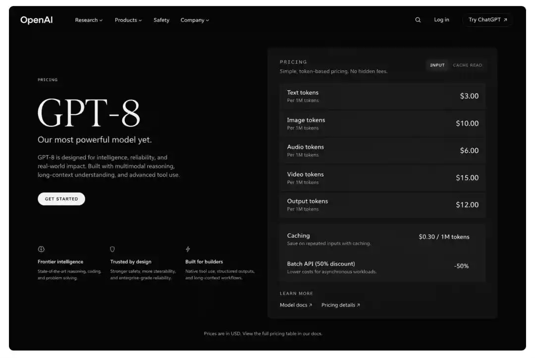 A tester asked the model to generate a hypothetical GPT-8 product pricing page. The resulting image had a layout that was indeed in the style of the OpenAI website, with button placement and font choices resembling those from a real interface, and the hierarchical logic of the price table was correct.