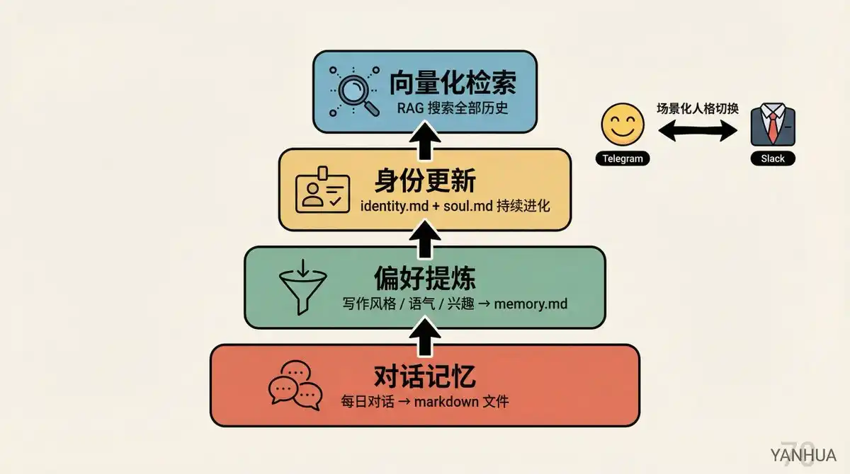 Contextual Personality Switching: Berman gave the AI two sets of personalities. In Telegram private chats, it's like a friend, humorous and casual; in Slack team channels, it automatically becomes a professional colleague style. These are defined in soul.md.