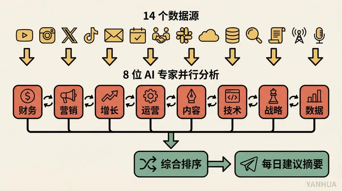 Analysis Process: 8 AI expert roles (Finance, Marketing, Growth, Operations, etc.), each independently analyzes all the data, running in parallel. After analysis, they discuss findings amongst themselves, reconcile disagreements, and merge into a prioritized list of recommendations.