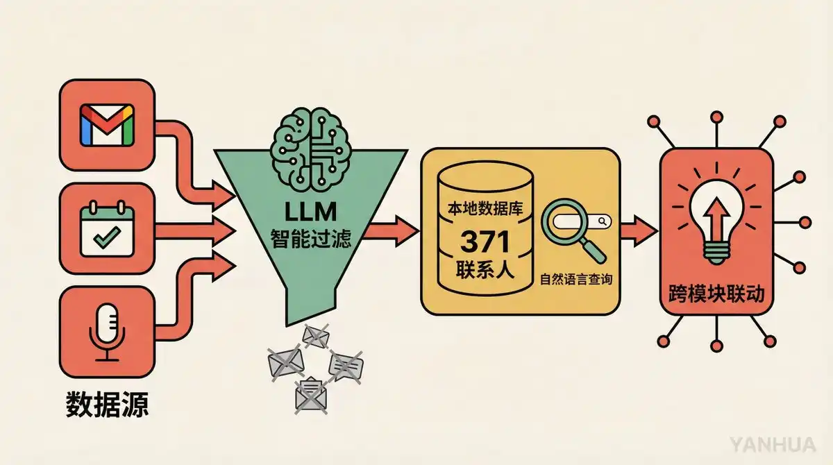 Data Ingestion: The system scans emails every 30 minutes and checks Fathom (an AI meeting transcription tool) every 5 minutes during work hours. All data is first judged by an LLM before being stored: Is this email worth saving? Is this contact important?