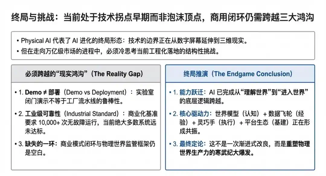 The gray rhino of safety and regulation. When thousands of robots with autonomous decision-making capabilities enter factories and even homes, who is responsible for accidents? The global regulatory framework for Physical AI is almost空白 (a blank slate).
