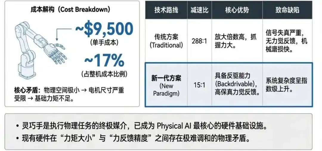 The difficulty of the dexterous hand lies in a fundamental contradiction: the finger space is too small to fit large motors; small motors have insufficient torque, requiring high reduction ratio gearboxes to amplify force; and high reduction ratio gearboxes bring inertial distortion, loss of force feedback, and mechanical wear—these three problems will 'poison' the AI's learning process from the physical level.