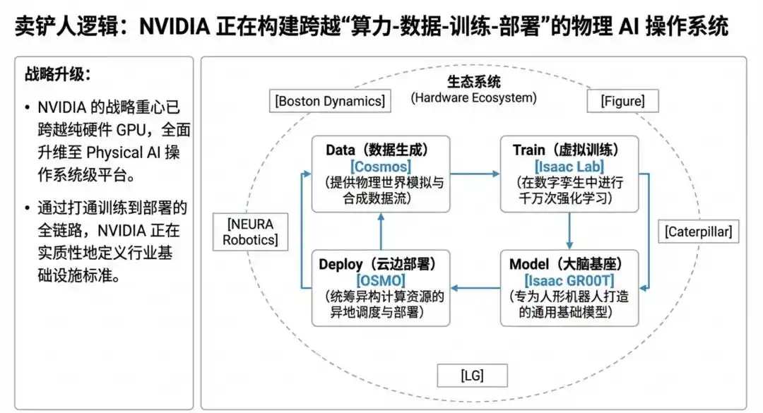 In the era of large models, NVIDIA became the biggest beneficiary凭借 (relying on) GPUs and the CUDA ecosystem;而在 (and in) the Physical AI era, its role is being further upgraded—not just providing computing power, but attempting to build an entire infrastructure for the robotics era.