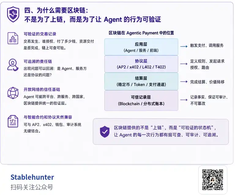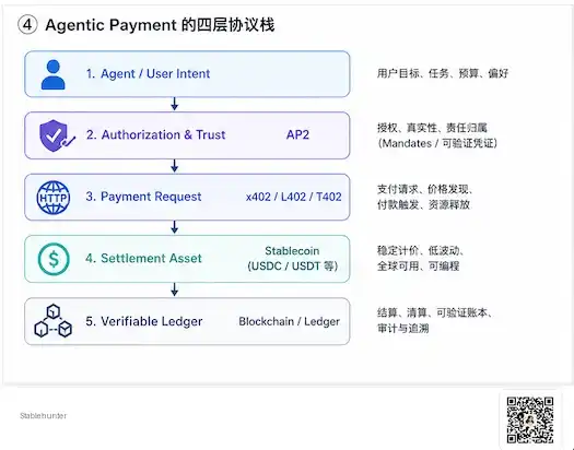 所以更准确地说,AP2 更像是 Agentic Payment 的授权与信任层,负责表达用户意图、授权范围和责任边界。x402、L402、T402 更像是支付请求层,解决 Agent 请求一个资源时,服务方如何向它发起付款要求。稳定币是结算资产,解决 Agent 用什么稳定单位付款。Blockchain 则是可验证状态层,解决交易记录、结算状态和后续执行能否被外部验证。